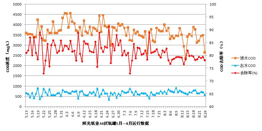本項目采用我公司自主研發(fā)的LIC高效厭氧反應器技術,自今年5月初開始調試,經過4個月的試運行,厭氧系統(tǒng)一直穩(wěn)定運行,并通過技術創(chuàng)新克服了造紙廢水鈣離子濃度高導致的顆粒污泥鈣化問題,使污泥活性保持在較高水平。厭氧反應器CODCr容積負荷達到17.0kg/ m3?d以上,CODCr的去除率可穩(wěn)定達到80%以上,遠超過目前國內外造紙行業(yè)廢水厭氧處理CODCr70%的去除率。本項目運行效果穩(wěn)定,保證了出水水質達標排放,獲得了業(yè)主的高度評價和贊譽!